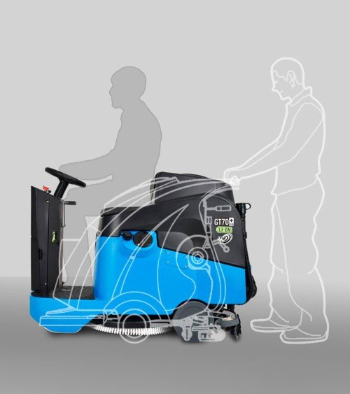 Es una máquina de hombre a bordo muy compacta, ideal para espacios con poca maniobrabilidad y áreas muy estrechas. Tiene dos tanques de 70L para agua limpia y recuperación respectivamente. DisponIible MODO ECO para un trabajo menos ruidoso y más duración de batería