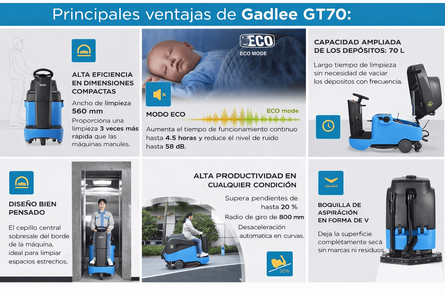 Si necesitas una barredora industrial que combine potenciamanejo fácil y eficiencia en espacios reducidos, la GT70 PLUS es la opción ideal. Perfecta para profesionales que buscan maximizar su productividad sin renunciar a la comodidad y la accesibilidad.