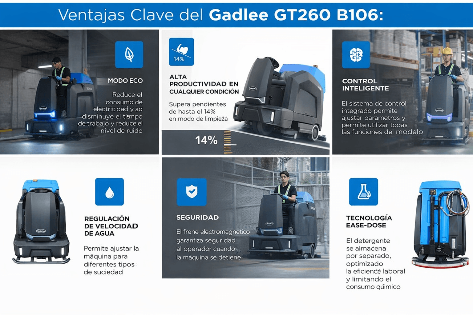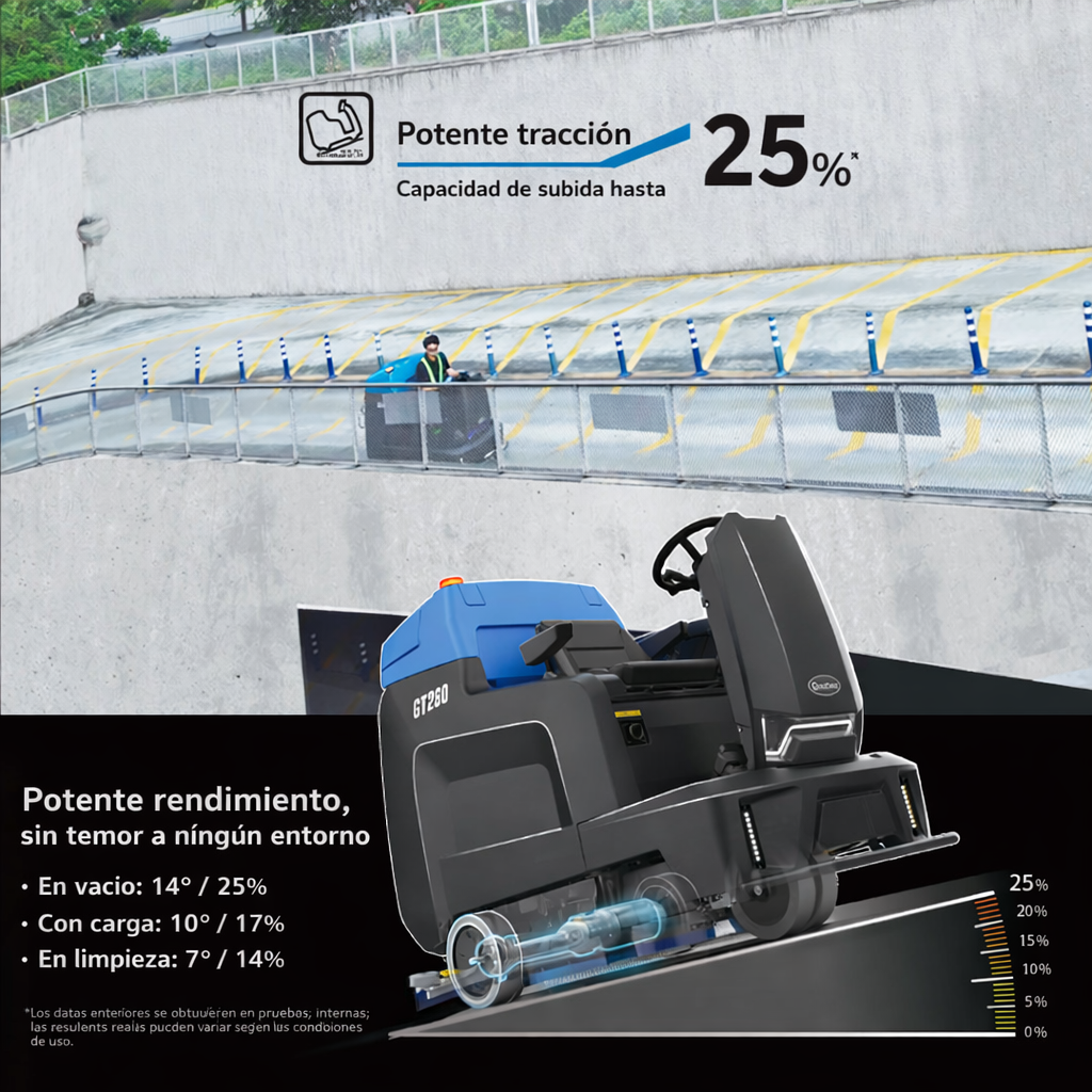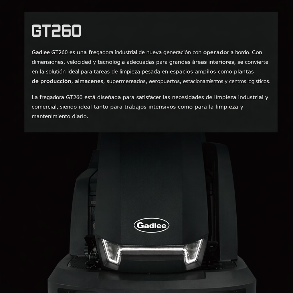 Gadlee GT260 es una fregadora-deshumidificadora autopropulsada de nueva generación, con tamaño, velocidad y tecnología para limpiar grandes áreas interiores. Este modelo es ideal para empresas, industrias y contratistas de limpieza que gestionan grandes áreas interiores como fábricas, almacenes, supermercados, aeropuertos, aparcamientos y otros centros logísticos.